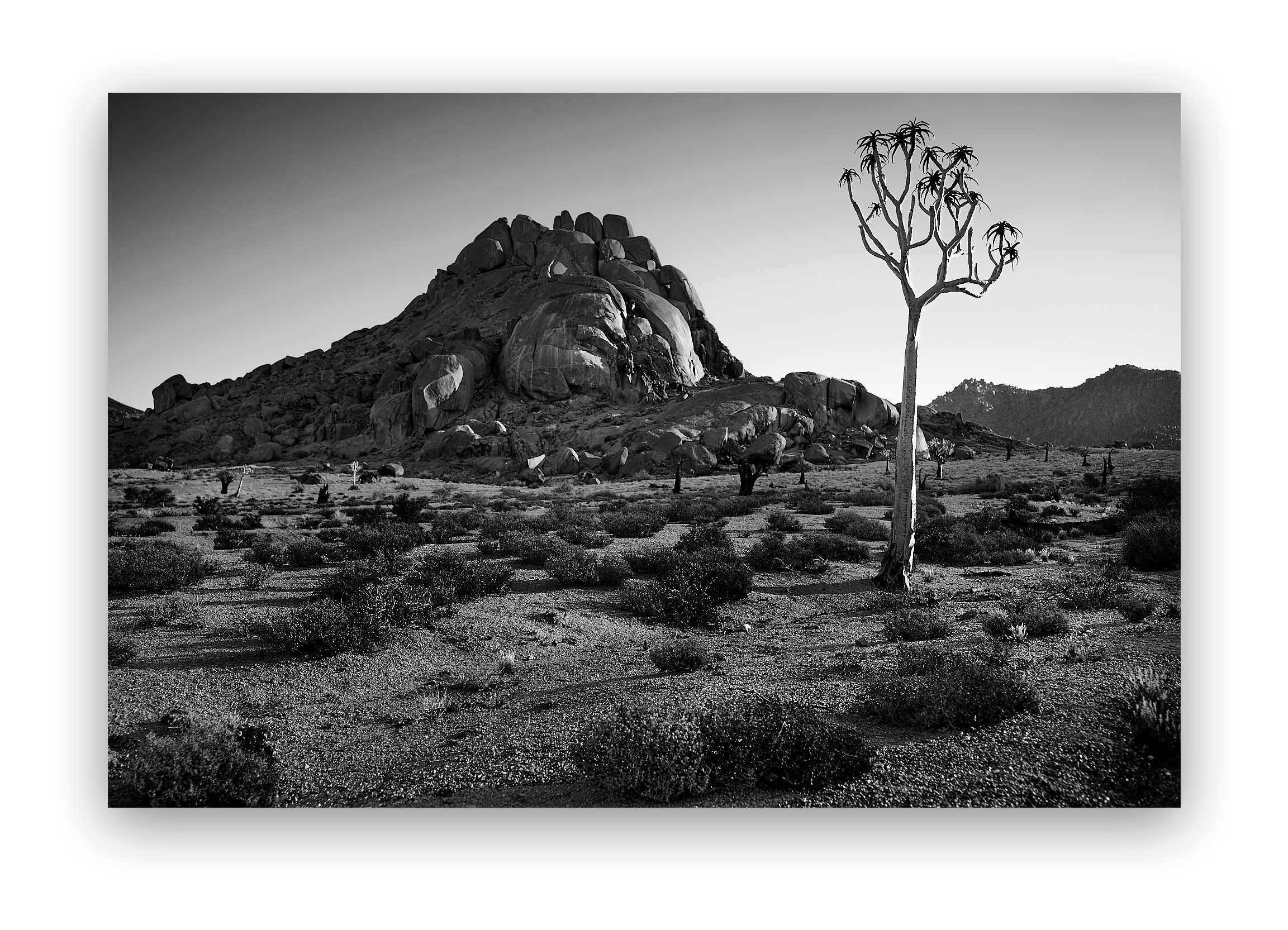 I'd been searching for days, driving through landscapes so ancient and raw they felt like another planet entirely, when suddenly I rounded a cluster of massive boulders—ancient granite giants that looked like they'd been carelessly tossed by gods—and there it stood. One tree. Alone. Its thick, peeling trunk reaching upward, those distinctive spiky branches creating sharp silhouettes against the bleached sky.