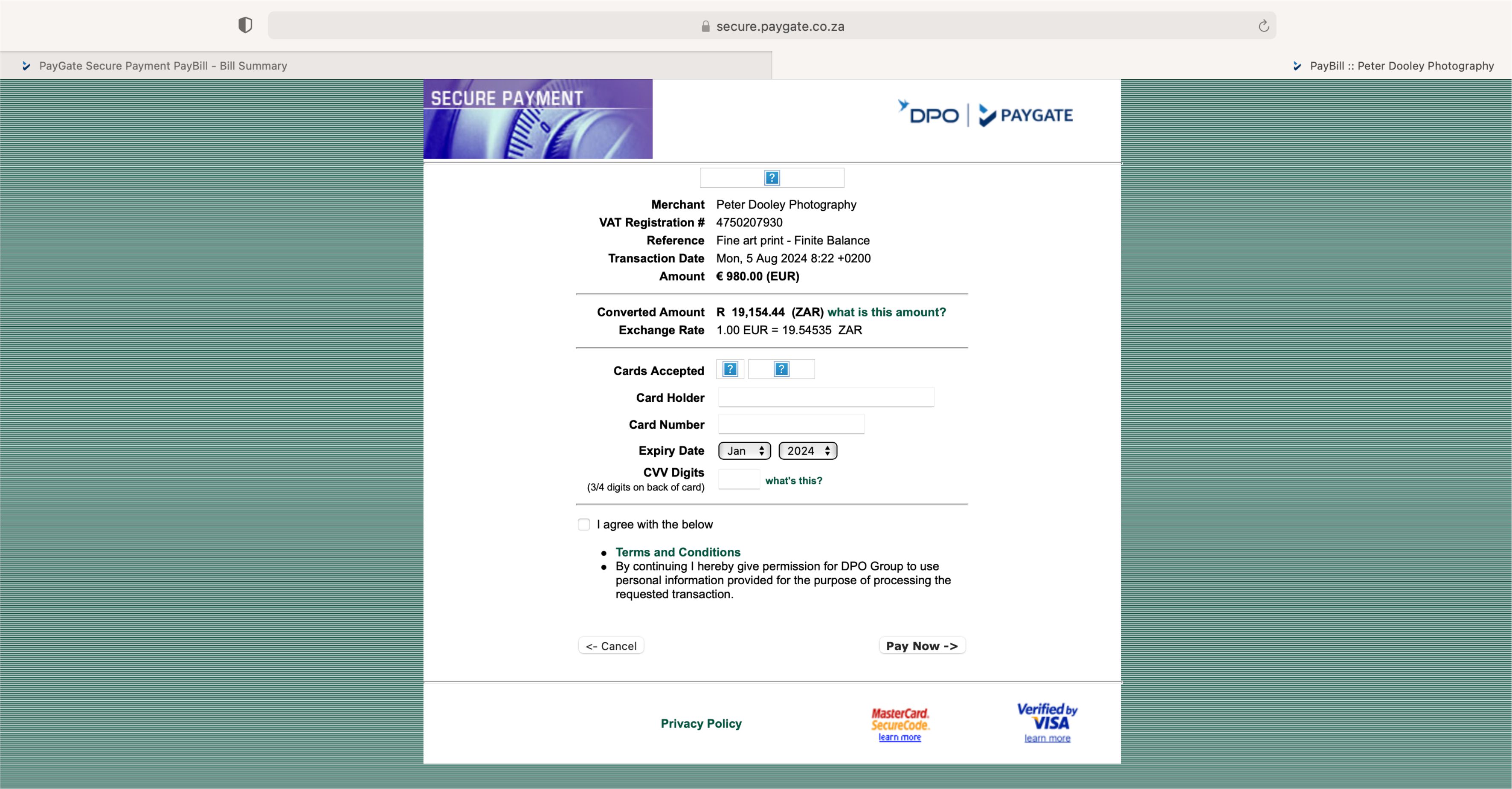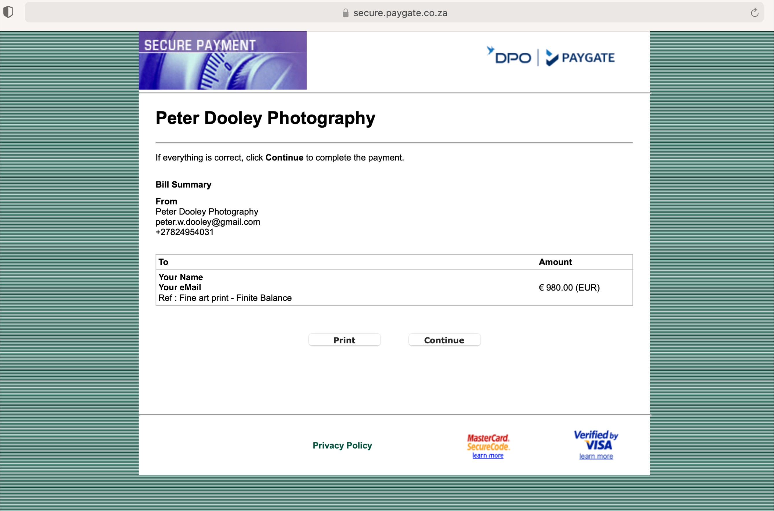 Whilst your order is being printed, and before shipping, our registered payment gateway bank will send you a 3D secure eBill card payment link via SSL secure site for payment of your order.