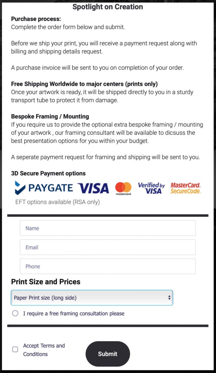 I offer a standard return policy and free shipping of rolled prints to all major centres, worldwide on all rolled prints.